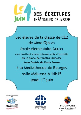 Le 1er juin 2017 à 14h15, les élèves de la classe de CE2 de Mme Ojalvo, école élémentaire Auron, présenteront à la Médiathèque de Bourges, salle Mélusine, une mise en voix d’extraits de la pièce de théâtre jeunesse Anne Droïde de Karin Serres, publiée aux éditions Lansman.