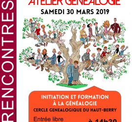 Nous vous donnons rendez-vous le samedi 30 mars à 14h30 à la médiathèque de Saint-Doulchard en compagnie du Cercle Généalogique du Haut-Berry. Entrée libre. Renseignements au 02 48 23 52 65. Share this… Facebook Twitter Linkedin Pinterest Copy