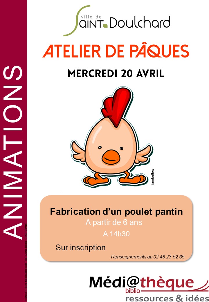 Afin de fêter ces arrivées et jeux gourmands, la Médiathèques propose aux plus jeunes (comme à leurs aînés évidement 😉 ) de venir apprendre à fabriquer un petit poulet-pantin. Offrez-vous cette courte parenthèse créative et profitez de vivre ce moment de partage en famille (doigts collés et mains colorées, c’est le risque, vous voilà prévenus !)