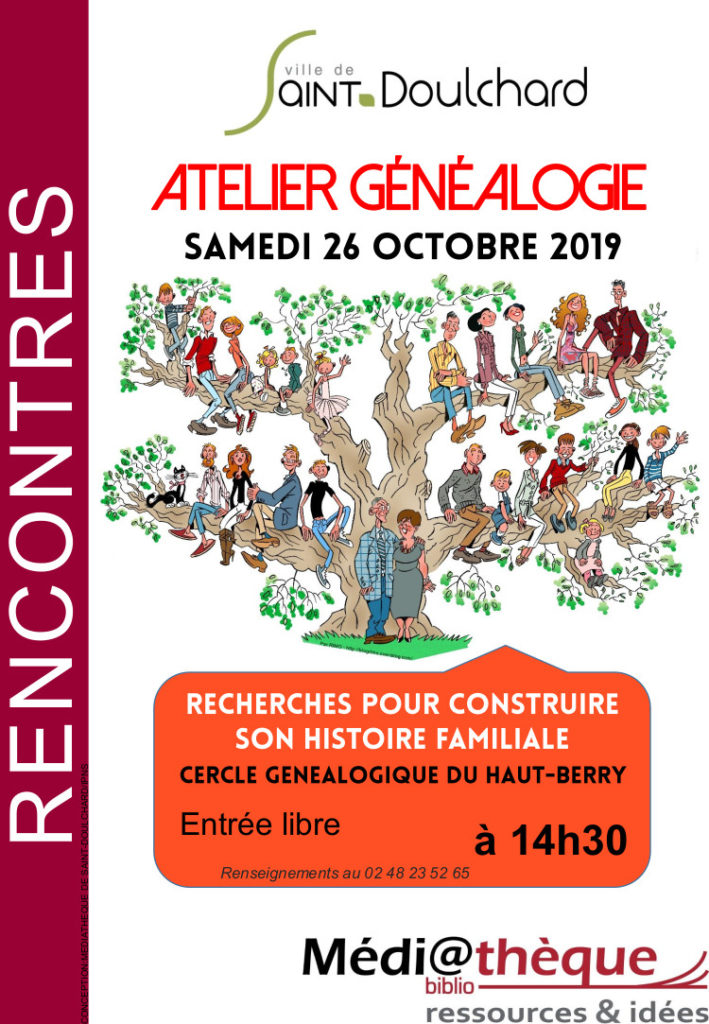 Atelier généalogie à la médiathèque de Saint-Doulchard !15 octobre 2019 dans Lire, voir, écouter, rencontrer par BM ST DOULCHARD Recherches pour construire son histoire familiale. Nous vous donnons rendez-vous le samedi 26 octobre à 14h30 à la médiathèque de Saint-Doulchard en compagnie du Cercle Généalogique du Haut-Berry Entrée libre. Renseignements au 02 48 23 52 65. Share this… Facebook Twitter Linkedin Pinterest Copy