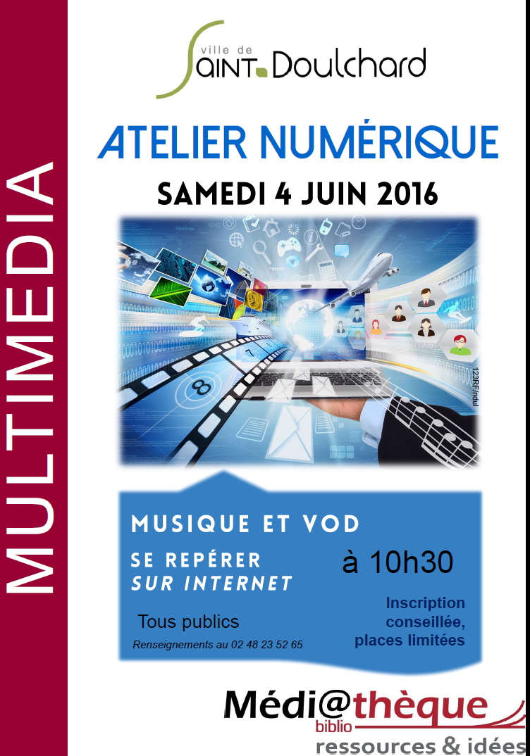 Atelier numérique à la médiathèque de Saint-Doulchard30 mai 2016 dans Lire, voir, écouter, rencontrer étiqueté Atelier numérique par BM ST DOULCHARD Venez nombreux à notre atelier numérique, le samedi 4 juin à 10h30 Le thème développé sera : comment trouver de la musique ou de la VOD sur Internet ? Tous publics L’inscription est conseillée, les places sont limitées. Share this… Facebook Twitter Linkedin Pinterest Copy
