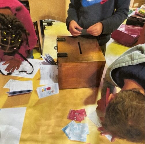 Nous sommes une classe de CE1-CE2 de 25 élèves. Myriam, la bibliothécaire, nous a présenté cinq livres, après la maîtresse nous les a lus puis nous avons dû voter pour notre livre préféré. Myriam nous a préparé le matériel de vote.