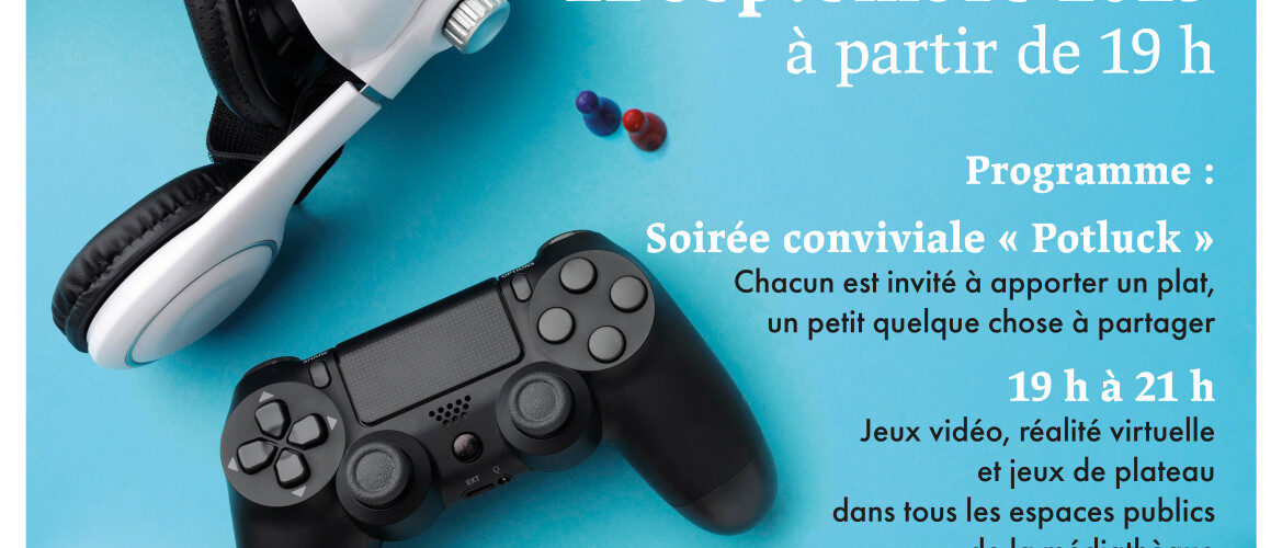 - 19 h à 21 h : Jeux vidéo, réalité virtuelle et jeux de plateau dans tous les espaces publics de la médiathèque