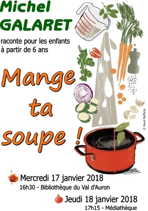 Le conteur, Michel Galaret, cuisine une vraie soupe au caillou sous les yeux des enfants. Un petit air de « cantou » (coin du feu) d’autrefois… avec son conteur ! Le temps de cuisson laisse la place à d’autres histoires sans oublier de surveiller la soupe ! De temps en temps, le couvercle se soulève… Hum !…Odeurs, parfums, impatiences…